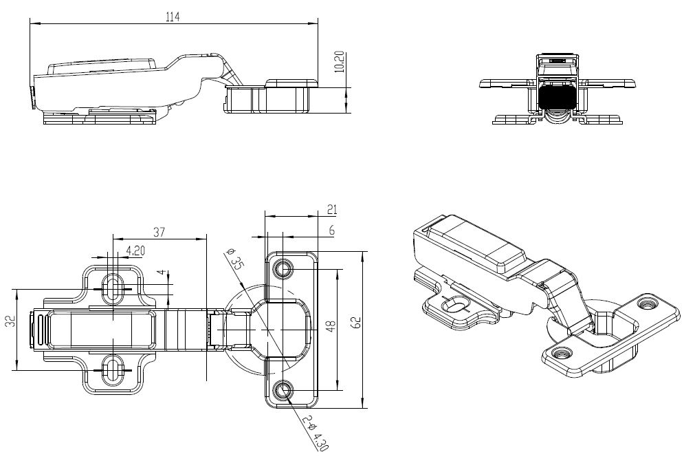 Soft Closing Hinge "B",ø35mm,Clip-On,H=0,Plate F/Wood Screws Half-Overlay, 100 Degree, Cup cc.:48mm,Mounting Plate F/Wood Screws, H:0mm,W/SISO Name Plate,Hydraulic Plastic Pump