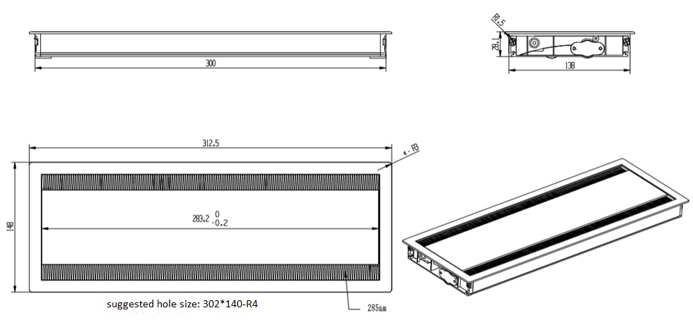 Soft Close Grommet "Flip" 312,5x148x28mm, Silver (RAL9006), Aluminium, W/Brushes (Suggested Hole Cutting: 302x140mm)