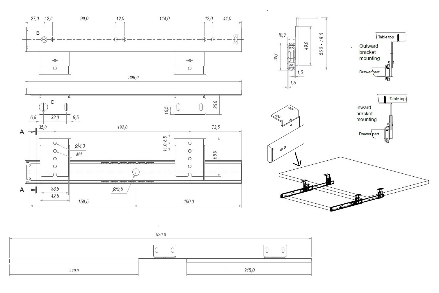 Keyboard Slide NJ2060, 308mm, W/4 Angle Brackets, BZP 35mm Profile Height, 30 KG Load Capacity