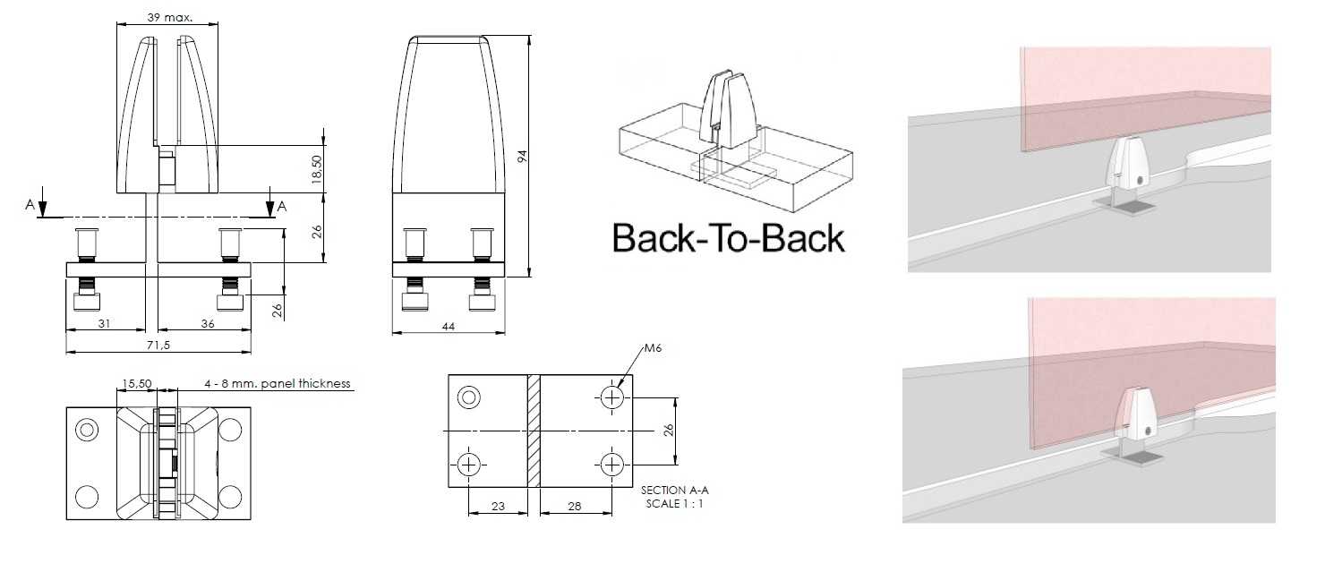 Partition Panel Clamp,Back-To-Back,Alu,Black Painted,F/4-8 mm Panel Thickness. Incl. 4 Pcs of Bolts M6x25mm & 4 Pcs. of Plastic Caps