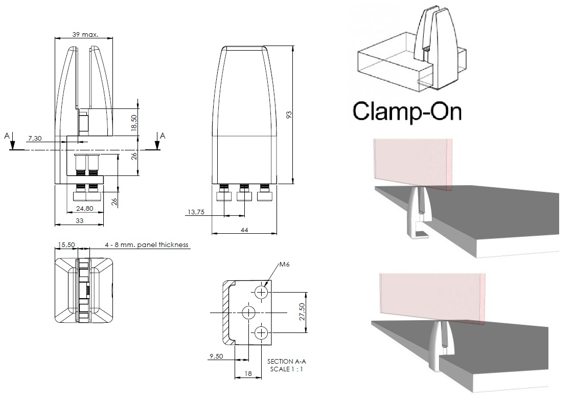 Partition Panel Clamp, Clamp-On, Alu,Silver Painted,F/4-8mm Panel Thickness. Incl. 3 Pcs of Bolts M6x25mm & 3 Pcs. of Plastic Caps
