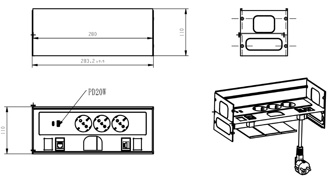 Power Box F/"Mambo"&"Punta" 283x110x110mm, Alu Anodized, W/ 3 x EU Sockets, 2 x USB (A+C), 1 x LAN, 1 x HDMI, 1 x EU Power Cable 1,8 mtr.