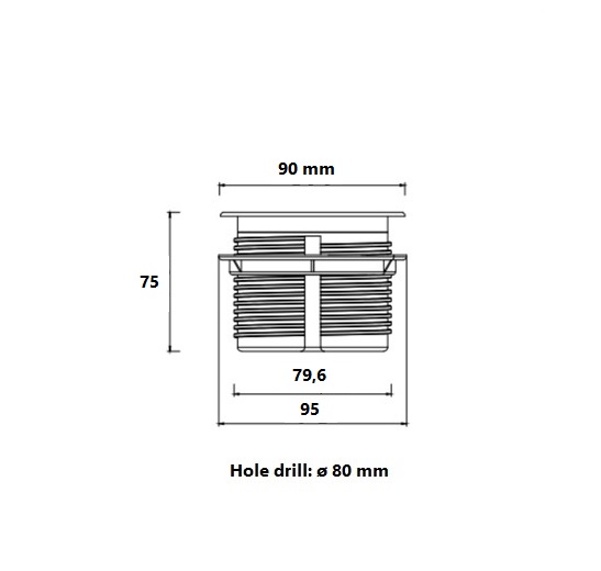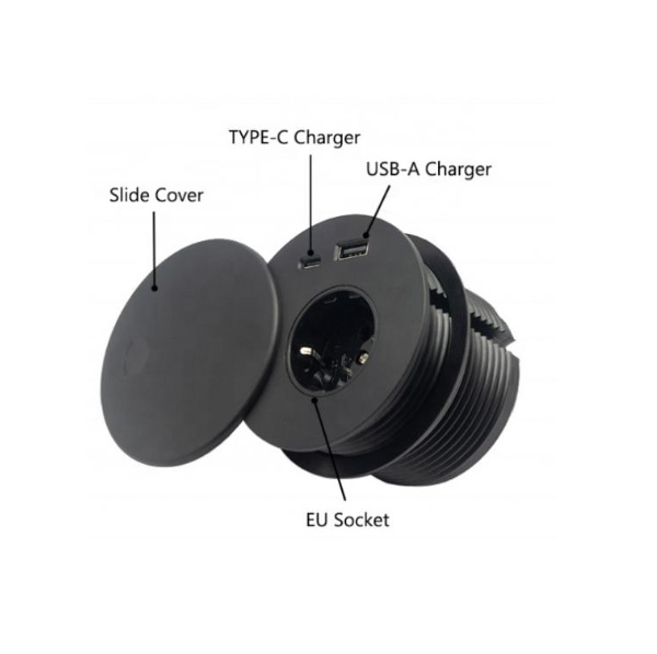 Power Socket W/Lid Cover, Black, ø80mm, 1 EU Socket+2 USB Chargers (A+C), W/150 cm EU Power Cable, EC/RoSH Certified, Over all Size: 90x75x79,5mm, Hole Drill: 80mm