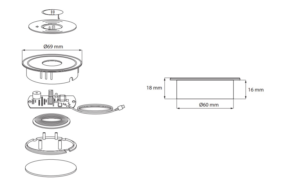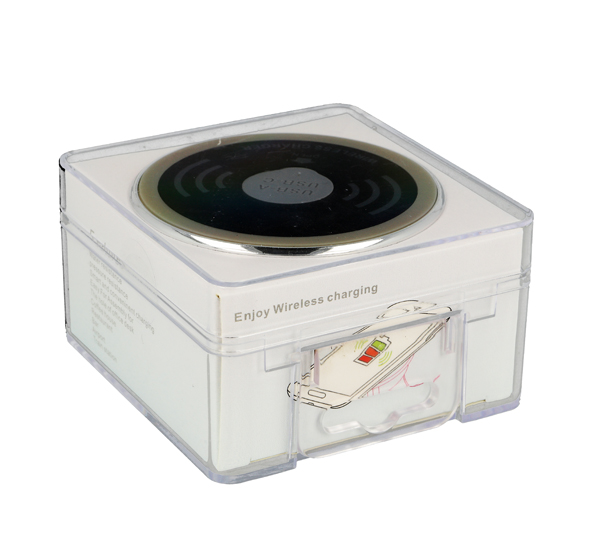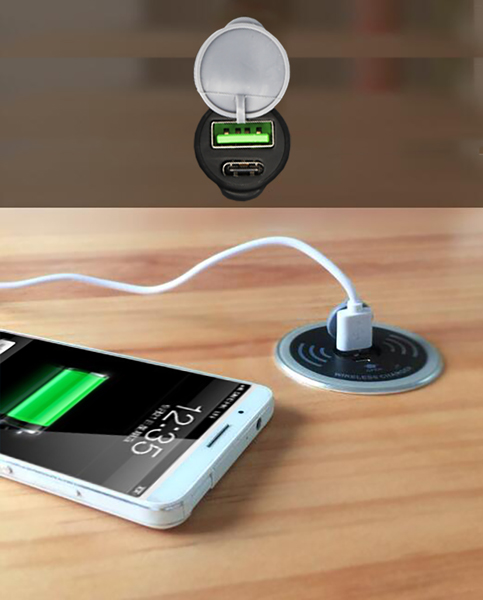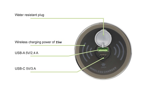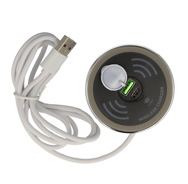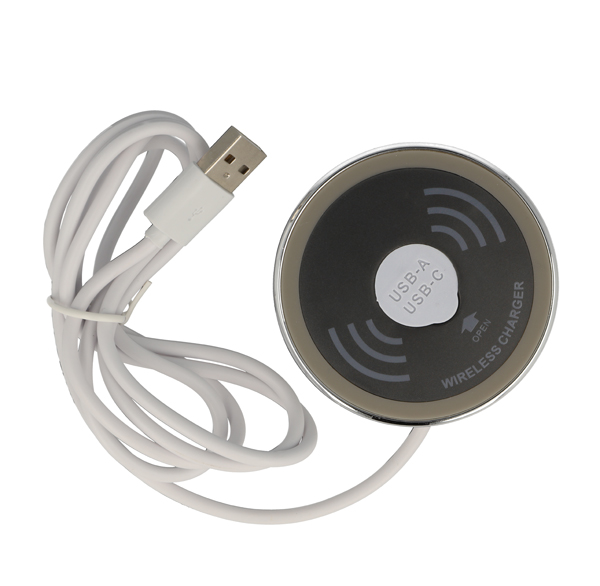 Wireless Charger Grommet, 15W, ø60mm, Black/Grey/CP Look ABS, Included USB-A & USB-C Charging + 1,1 Meter Cable With USB Plug- Not Suitable For Charging Via PC USB Port, Incl. White Power Adapter Plug: QC3.0 Quick Charger
