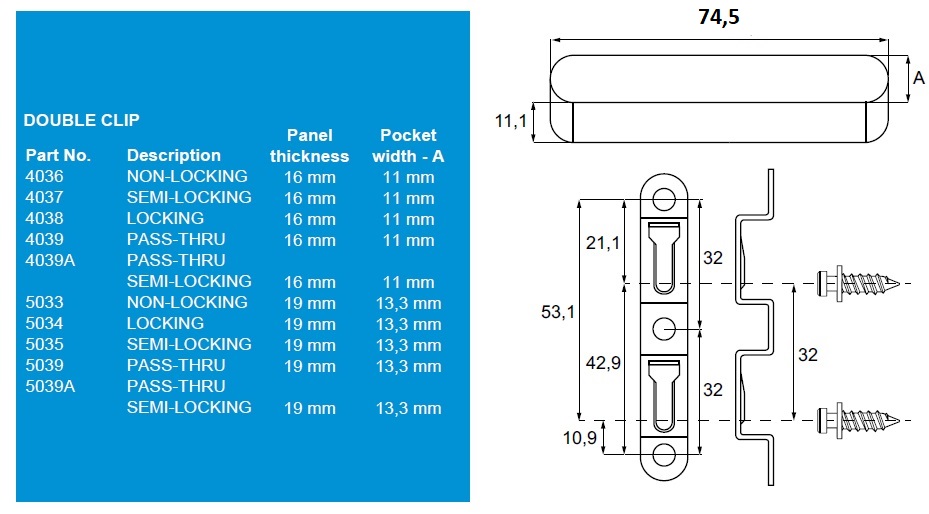 "INVISIO" Double Clip #5035, F/19mm Panel, Semi Locking