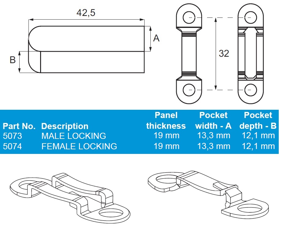 "INVISIO" Male Anti-Rotation Clip #5073, Locking, 19mm Panel