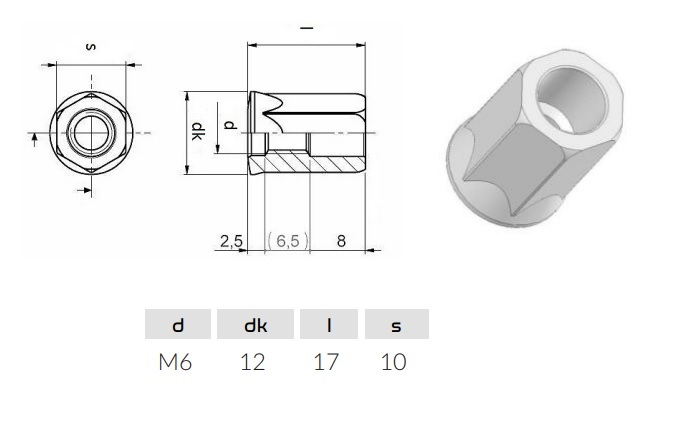 Extra Screw Nut F/11.04.425-0, M6x17, 10mm Hex, Steel BZP
