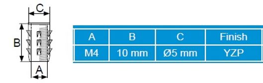 Knock In Bushing "A", M4x10mm, Zamak, Yellow Zinc Plated