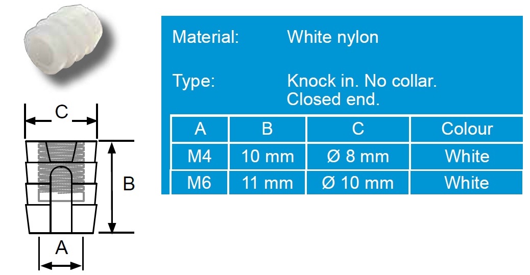 Knock-In Bushing N-410, M4, ø8x10mm, White Nylon, Closed