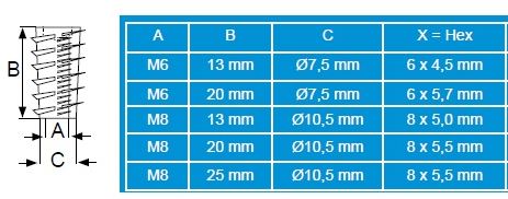 Screw-In Bushing E-825, M8x25mm, Zamak, YZP, Hex 8x5,5mm