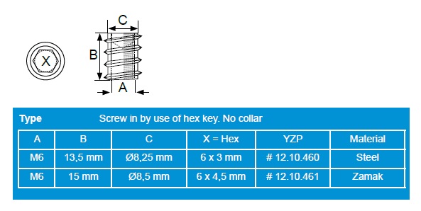 Screw-In Bushing SK-614, M6x10x13.5mm, 6mm Hex, Yellow ZP