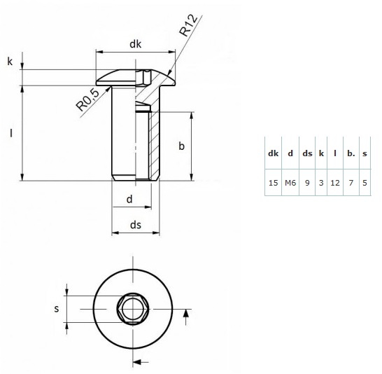 Steel Head D-564, 5mm Hex,M6,Head ø15x2mm,Shaft ø9x12mm,NPL