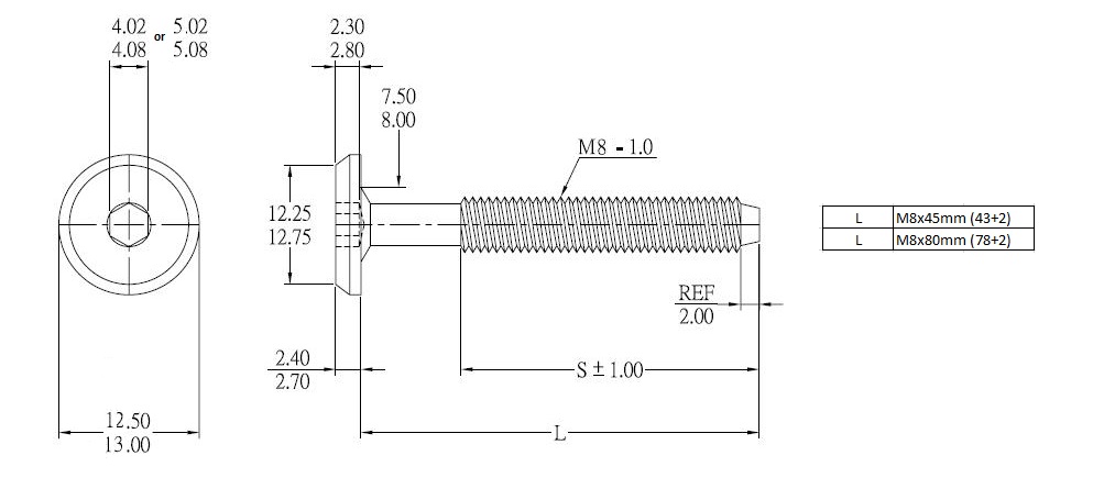 Fifteen Screw, M8x45mm, YZP, Hex 5mm, Conical, Full Thread