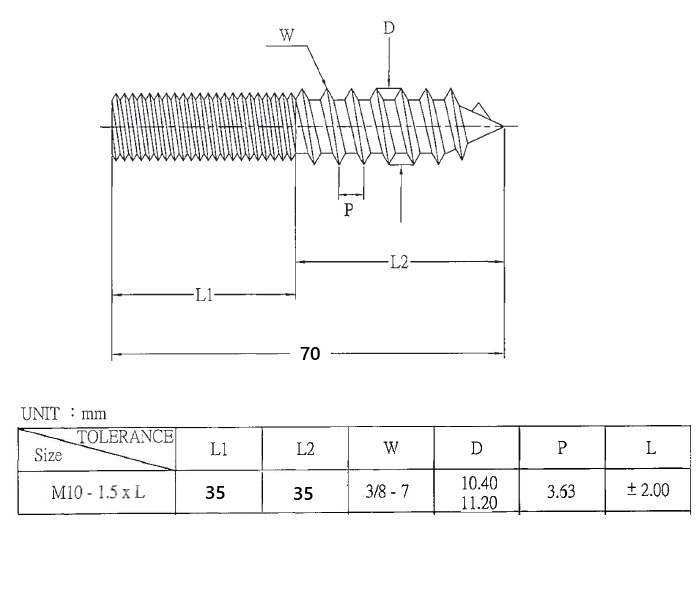 Hangerbolt, Cylindrical, M10x70mm, 50/50, Steel-YZP