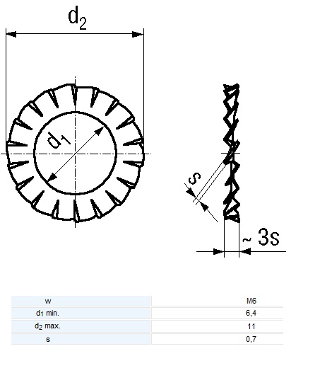 Serrated Lock Washer, DIN 6798A, BZP, ID 6,4mm, OD 11mm