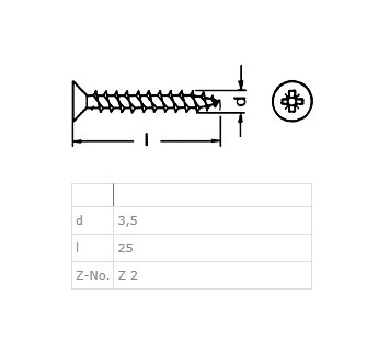Chipboard Screw, CSK, PZD, SS A2, ø3,5x25mm, Fully Threaded