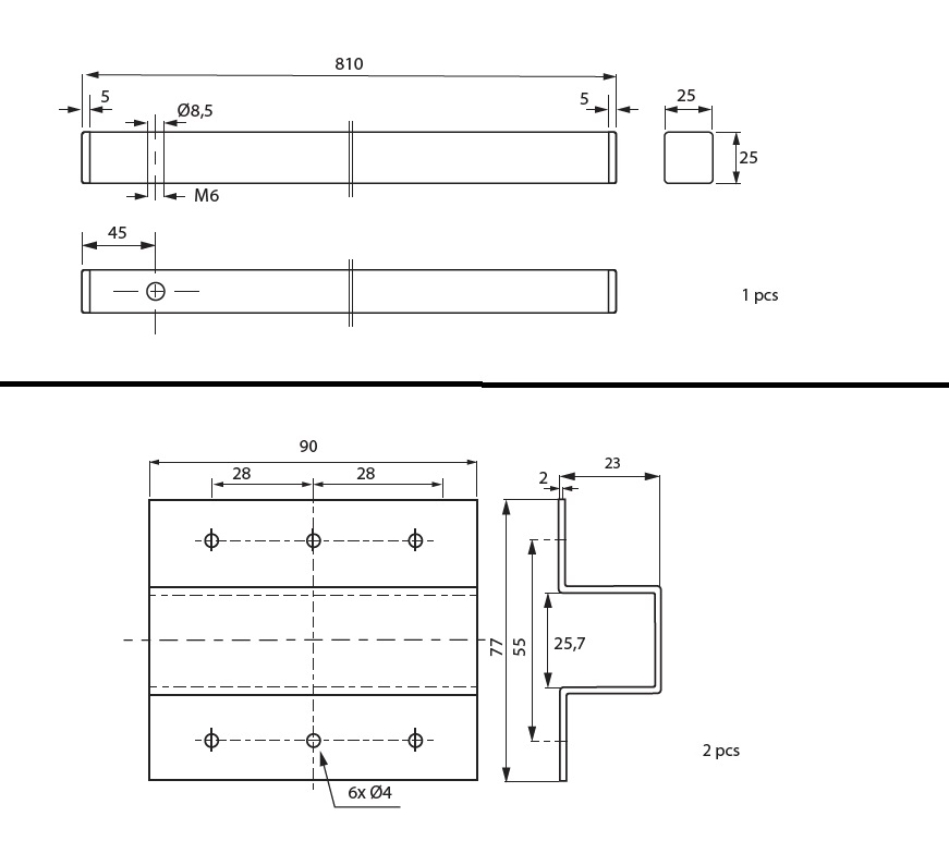 Table Extension Bar 810mm, Steel Black Matt, W/2-U-Brackets 77x90x28mm, 2mm Steel, Max Pull Out 500mm, (1 set = 1 Bar + 2 Bracket, Incl. 12 Mounting Screws + 1 Steel Bushing M6x15mm + 1 Adjustable Glide M6x38mm