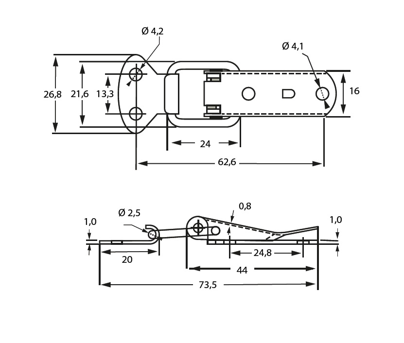 Table Catch "Spring" , Steel-YZP, 44x16 x1mm, W/Spring Function. Incl. Striker