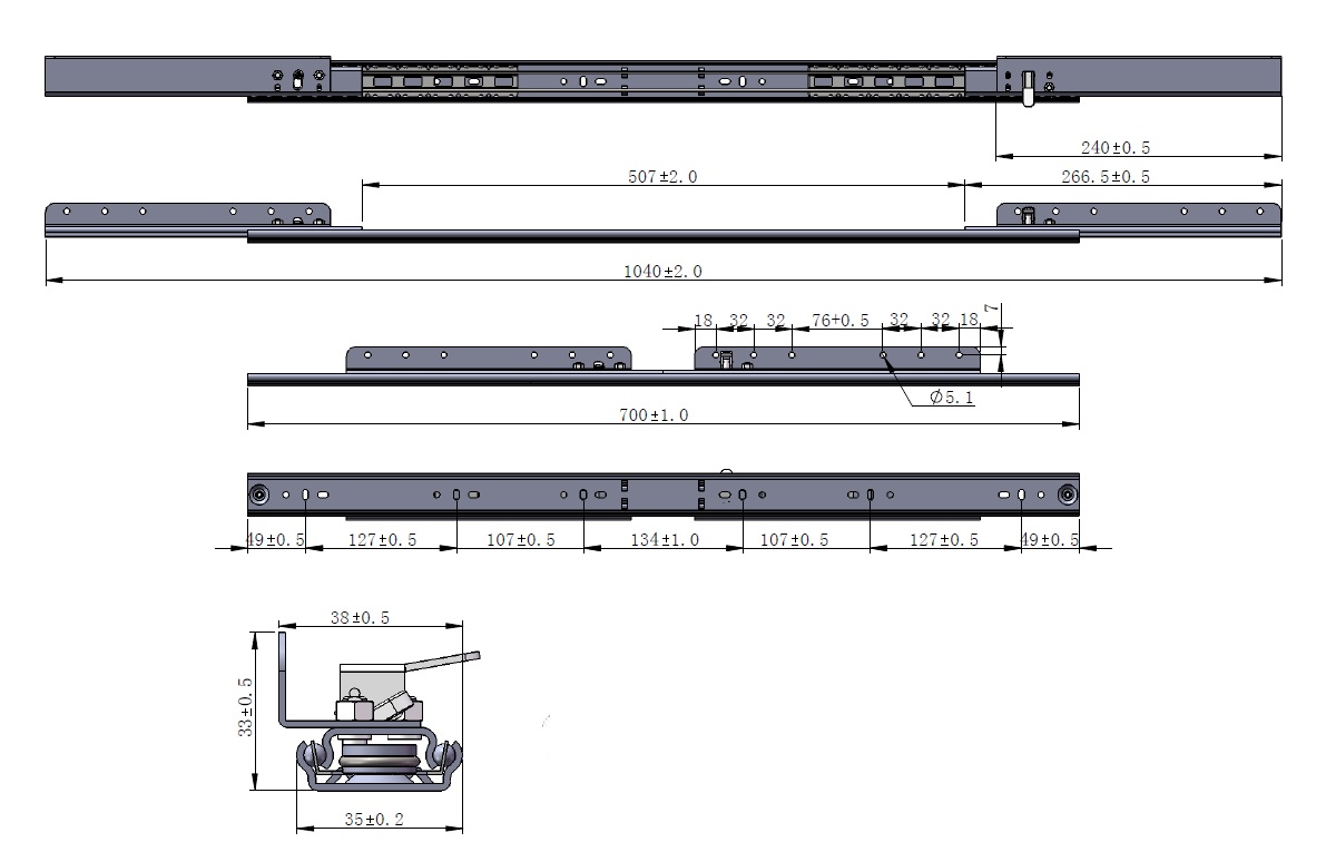 Synchron Slide 700/507, Opening 507mm, W/Brake, Total Open Lenght:1040mm, Closed Lenght:700mm, Opening:507mm Profile Height: 35mm, Mounting Height 40mm, Wing Size:240mm Metal Brake, Steel Thickness 1,5mm, Load Capacity 60KG