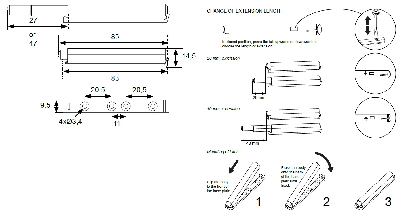 Touch Latch Slim W/Soft Bumper, Black, 85x14mm 20 or 40mm Extension By Use Of Switch Tab,Black Plastic, Screw-On Type