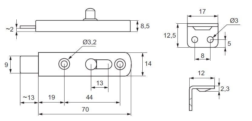 Sliding Bolt "Plastic", 70mm, Black, W/L-shaped NPL Stopper