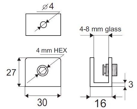 Shelf Support "Square", CPL, 27x30x16mm, 4-8mm Glass, ø4mm Mouting Hole, Tightning Screw With 4mm Hex Hole