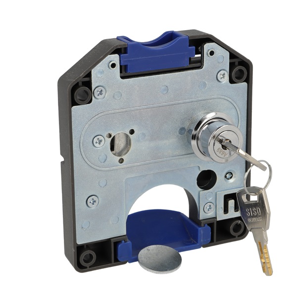 Coin Lock F/1 Euro,W/MIC System #01,CPL, LH,Snake SISO Metal Keys, Black Plastic Body, Coin Entrance & Exit All Blue Plastic, W/SISO Logo on Lock Body, w/Chrome Plated Rosette, Included 1 Master Key + MIC Key Pr. Inner Box