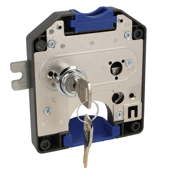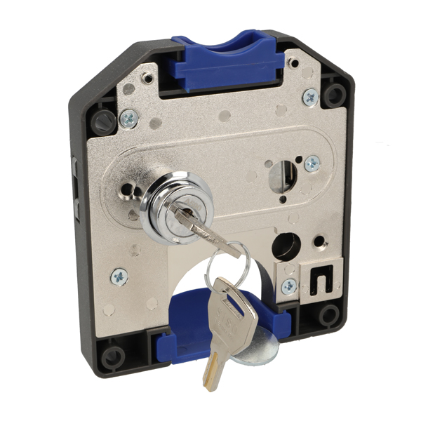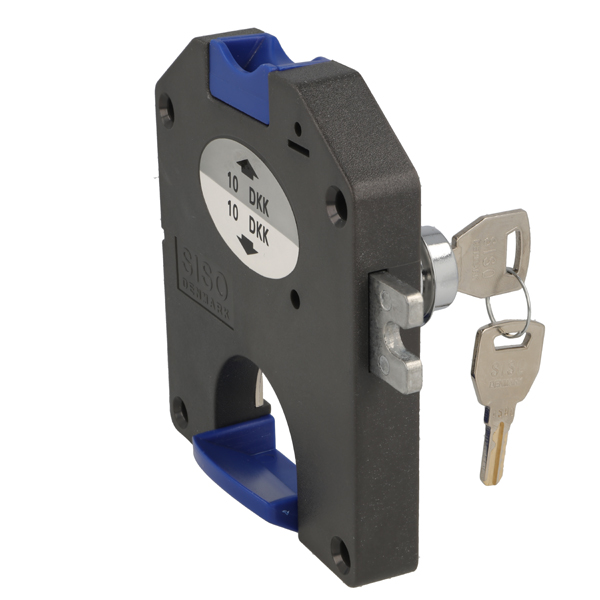 Coin Lock F/10 DKK,W/MIC System #01,CPL,RH, Snake SISO Metal Keys, Black Plastic Body, Coin Entrance & Exit All Blue Plastic, W/SISO Logo on Lock Body, w/Chrome Plated Rosette