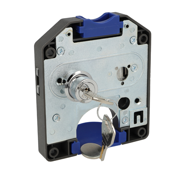 Coin Lock F/2 Zloty,W/MIC System #01,CPL,RH,Snake SISO Metal Keys, Black Plastic Body, Coin Entrance & Exit All Blue Plastic, W/SISO Logo on Lock Body, w/Chrome Plated Rosette