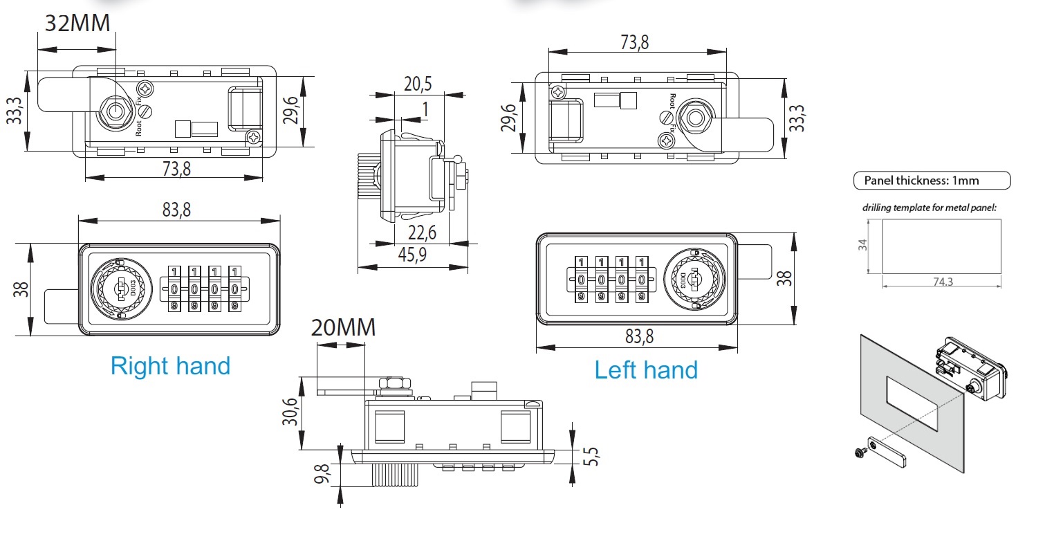 Combi. Cam Lock M237,4-Digit, LH, 180DG, "Public or Private" Setting By Switch Button, w/Master Key & Decoding Function. Black ABS Housing, Zamak Cylinder, W/Hex Nut, Washer & Cam Plate No.3, Master Key System D001