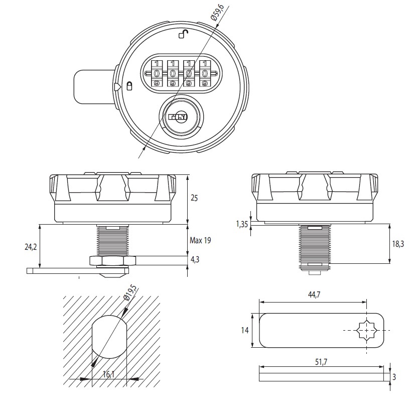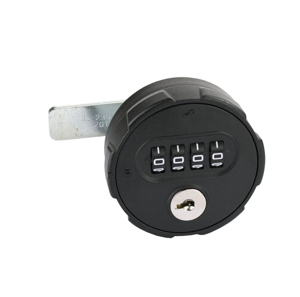 Combi. Cam Lock M300,4-Digit,RH,ø60x25mm,Black,90DG,"Public" , Straight Cam,C/E:45mm,W/Hex Nut, Precoded 0000, Master Code A201. F/Panel Thickness <19mm, Plastic Housing