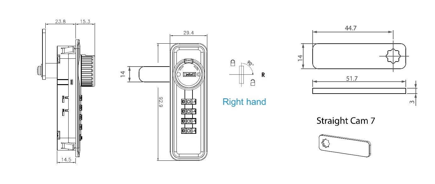 Combi. Cam Lock M3002,Public,RH,4-Digit,M+Code Finder, Over Turn Knob Protection, Str. Cam C/E:44,7mm, Master Code A301, Vertical Installation, Panel Thickness from 0,8 to 22 mm By Use of Various Back Plates