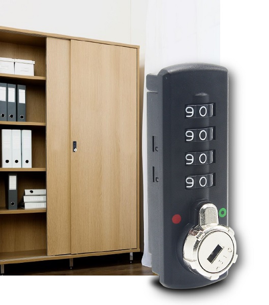 Combi. Push Lock M330, 4-Digit, 90DG, "Public/Private", F/ Sliding Wooden Doors 16-20mm, Setting By Switch Button, Master Key & Decoding Function, Master Key 14.08.256-0, Vertical Installation. F/Metal Panels Use 14.08.269-9
