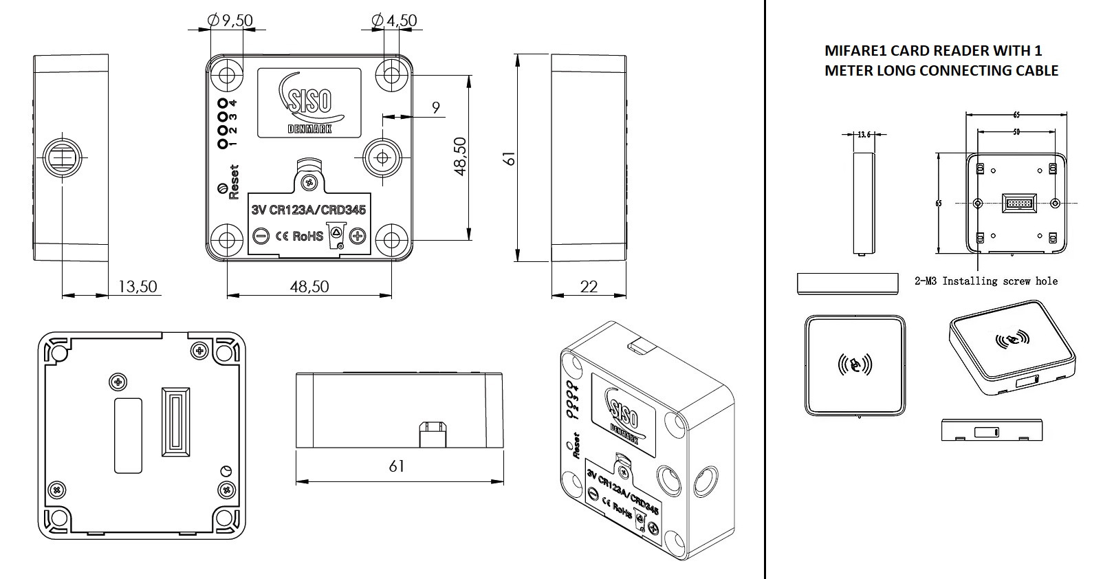 Invis. Mifare1 Lock "Mini" W/Card Reader, 61x61x22mm, Black ABS, No Accessories, No Batteries, 1xCR123A Lithium Battery To Be Used, Can be Programed to Public, Private or Office Mode W/Non Locking & Low Battery Alarm, Protection Cover to be bought Separately, 1 Mtr. Connection Cable F/Card Reader
