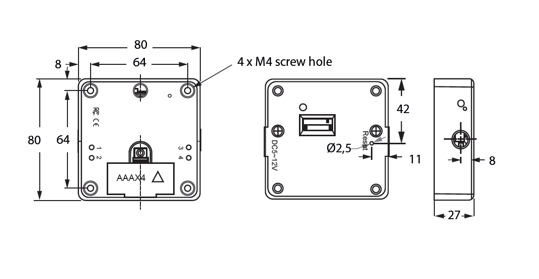 Invisible Mifare1 Lock (13,56MHz), 80x80x27mm, Black ABS, No Accessories, No Batteries, 4xAAA to Be Used, Can be Pro- gramed to Public, Private or Office Mode, W/Non Locking & Low Battery Alarm