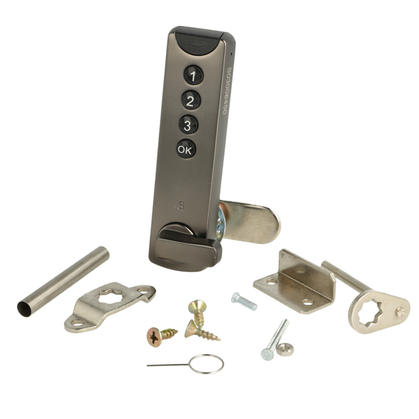 Elec. Combination Cam Lock, "Dave", Private, Gun Metal Grey, 93x25x9,1mm, CE: 32mm(Battery CR1220 Not Included)-Included: 1Pcs. Striking Plate, 3 Pcs. Cam Plate, 1Pcs. Needle, 2Pcs. Washers, 2Pcs Nuts, 7Pcs Screws, 1Pcs Tube ø6x50mm. Download User Guide From www.siso.dk