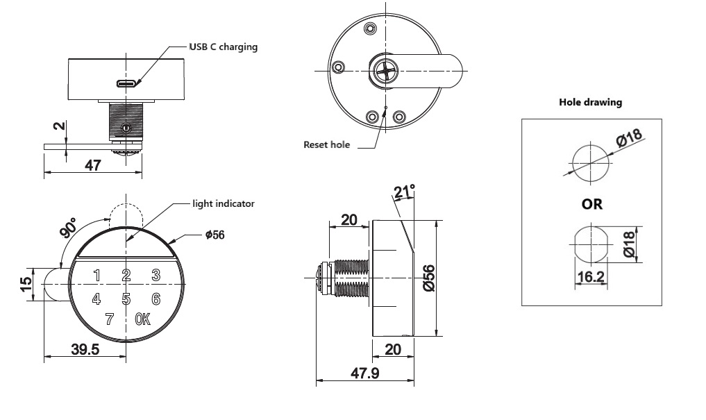 Elec. Touch Pad Cam Lock "Mary", ø19x20mm, ø55mm,Zamak Knob, Silver/Black,W/USB C Charging Cable,Straight Cam ce: 39,5mm, 90 DG Turn, Right or Left by Use of Turning Degree Washer, W/Built-in Lithium Battery, Public/Private
