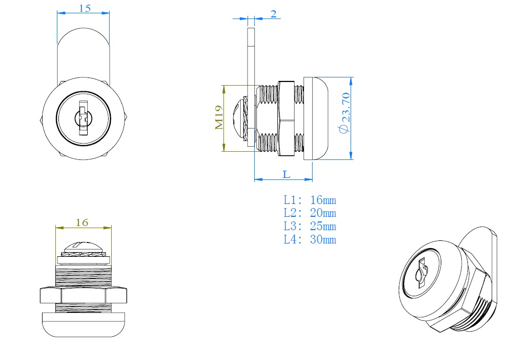 Cam Lock 1916, 180DG, SS Cap+Core, Str. Cam No. A09 W/Hook CK:SISO, W/2 Transparent PVC Washers