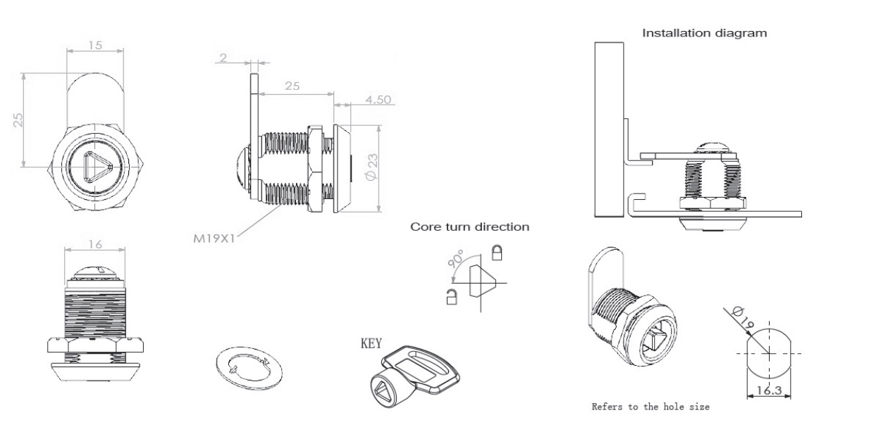 Cam Lock 1925, 90DG, W/Triangular Zamak Bit Key, Cam A01,CPL Max. 20mm Panel Thickness