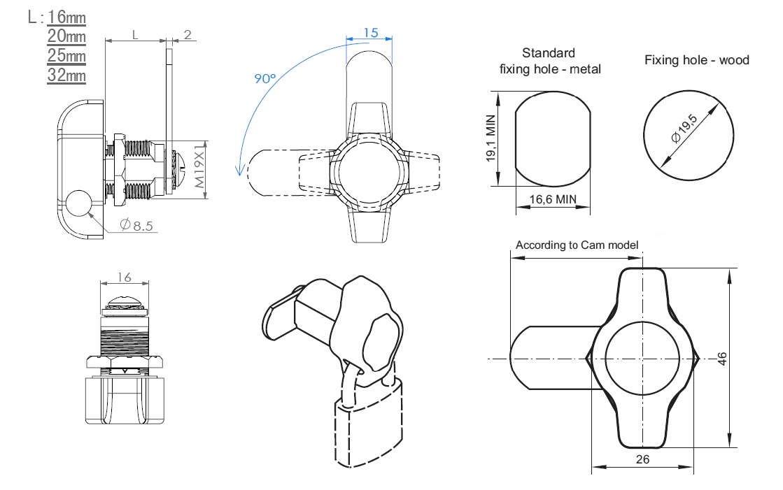 Padlockable Cam Lock #300R, 90DG, ø19x20mm, CPL, Cam A04, Straight C/E: 40 mm, NO Anti Rotating Plate, F/Shackle Size Ø5 - to 7 mm - min.16mm Width