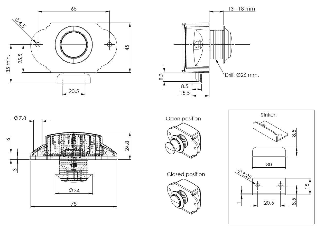 Push Lock "RV", F/13-18 mm,"Round", CPL Plastic Knob & Brown Body, Inkl Steel L-Shaped Striking Plate