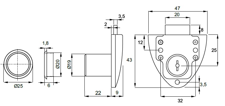 Rim Lock 850N, ø19x22mm, Black Anodized, CK SISO, W/Screws
