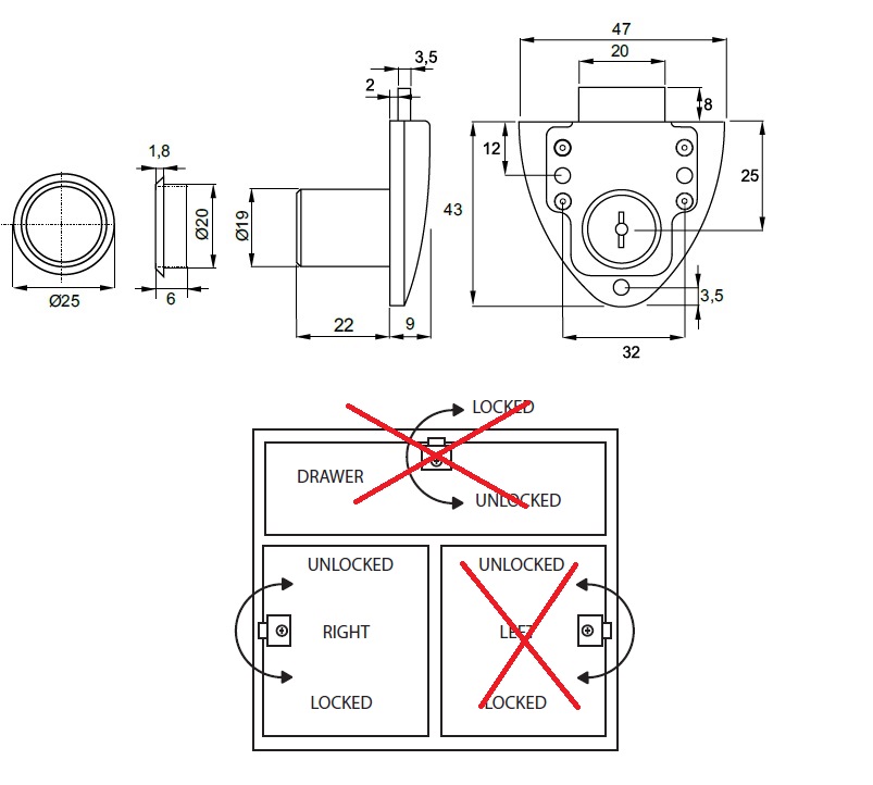 Rim Lock 850N, ø19x22mm, Right, NPL, CK SISO, With Screws