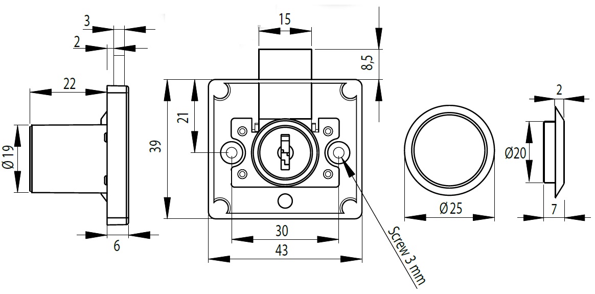 Rim Lock 852, ø19x22mm (Slim Case), Nickel Plated, CK SISO