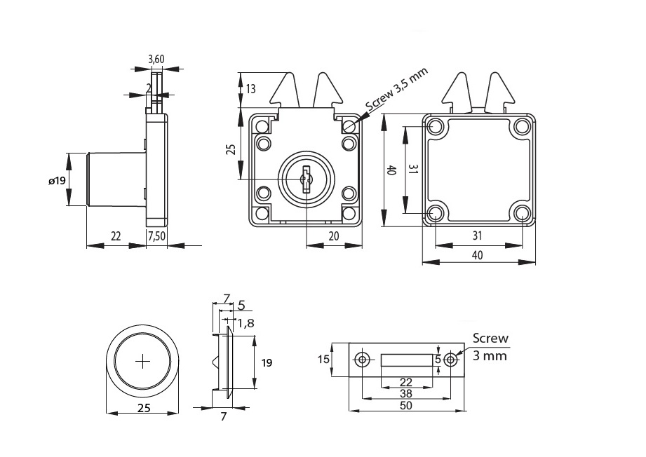 Roll Blind Lock 855, ø19x22mm, NPL, CK SISO, KA D20, W/Flat Striking Plate