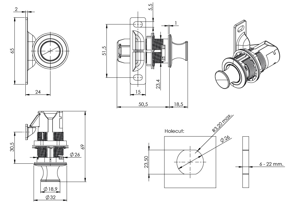Push Latch Lock,"Yacht" Zamak Knob,CPL, Black ABS Body,F/6- 22mm Panel Thickness, Incl. Black Plastic Striker, Slam Lock Function