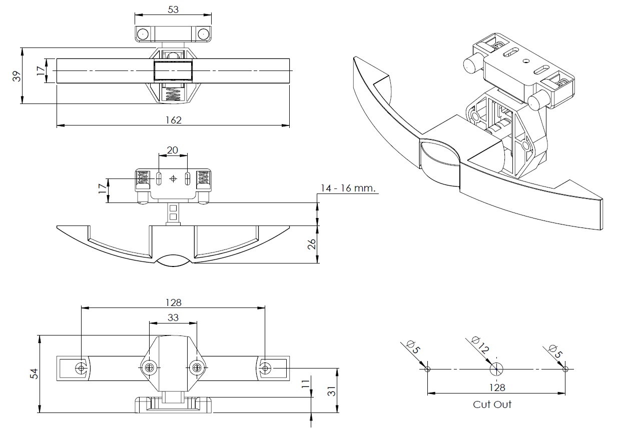 Slam Lock Handle "RV", 14-16mm, cc128mm, SS-Look,Zamak Hand- le & Grey ABS Housing, Incl. Grey ABS Striker W/Spring Tension